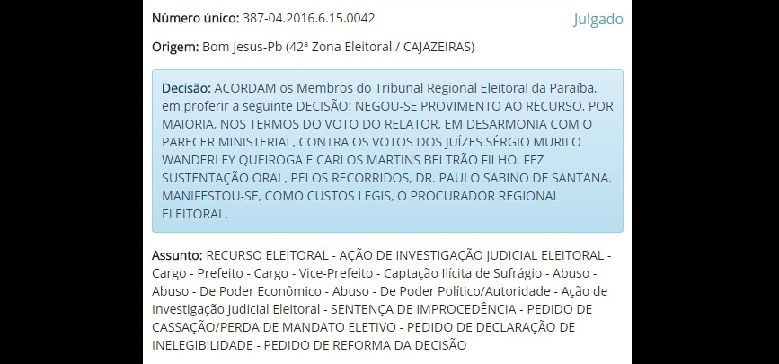 O gestor já havia sido absolvido na primeira instância, mas a parte contrária recorreu para o TRE, tendo o relator do processo, juiz Breno Wanderley, negado provimento ao recurso, em desarmonia com o parecer do Ministério Público Eleitoral, que pedia a aplicação de multa prevista no §4º do artigo 73 da Lei n.º 9.504/97.