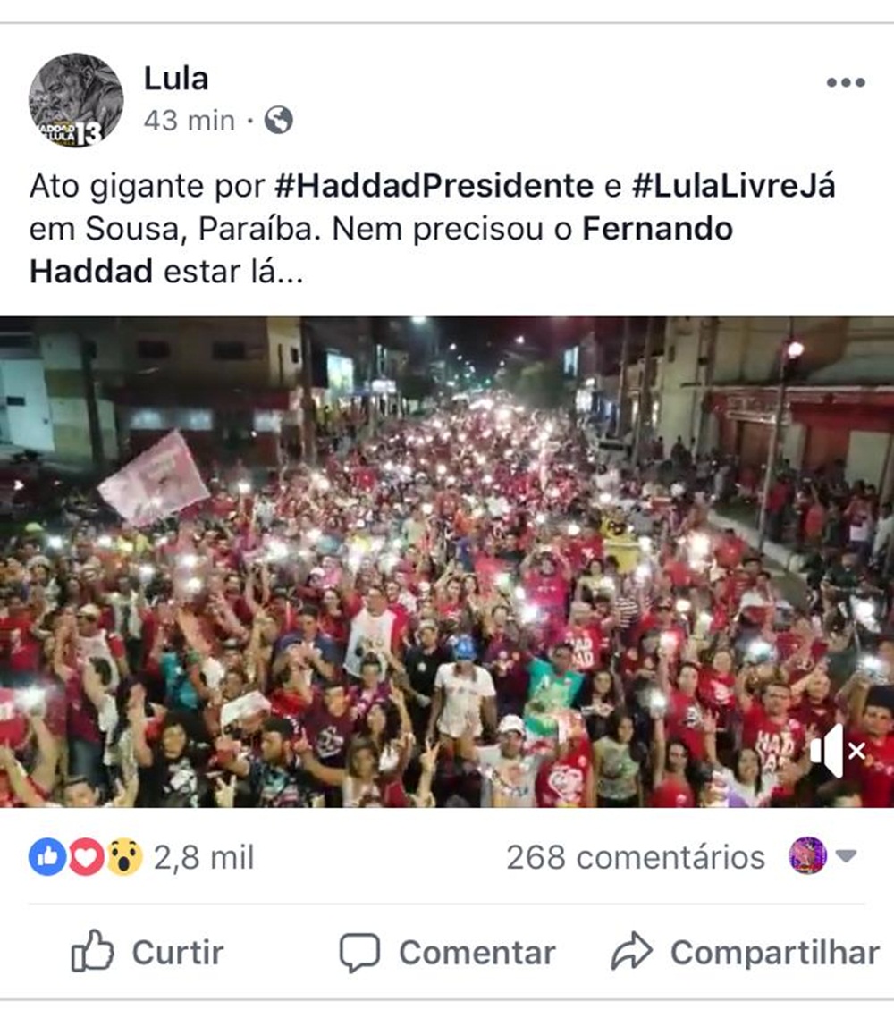 “Ato gigante por #HaddadPresidente e #LulaLivreJá em Sousa, Paraíba. Nem precisou o Fernando Haddad estar lá…”, postou o administrador da rede social.