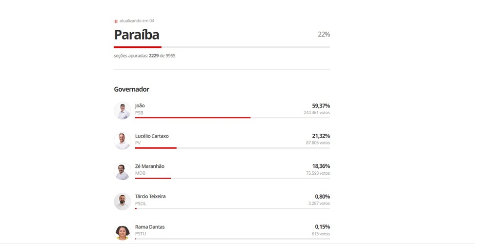 Com 2229 urnas computadas, totalizando 22% das urnas, aparece João Azevedo (PSB) na frente com 59,37%