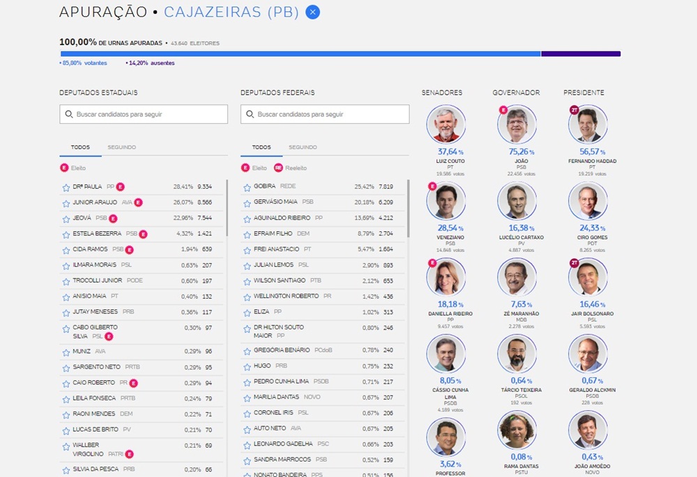 Cajazeiras surpreende em votação para presidente, governo do estado, senado e deputado