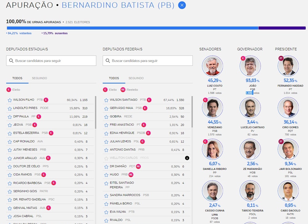 O governador eleito João Azevedo (PSB) teve a maior votação em termos percentuais na cidade de Bernardino Batista, Sertão da Paraíba. Apoiado pelo prefeito Gervázio Gomes (PSB), o socialista conseguiu 1.689, o que representa 93,83% dos votos válidos, enquanto o segundo colocado, Lucélio Cartaxo (PV) conseguiu apenas 62 votos.