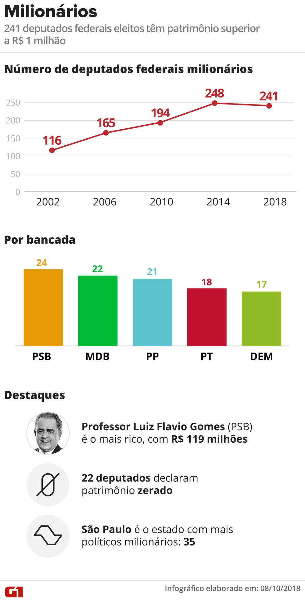 Fonte: G1 - https://g1.globo.com/politica/eleicoes/2018/eleicao-em-numeros/noticia/2018/10/09/numero-cai-mas-quase-metade-da-camara-sera-formada-por-milionarios.ghtml