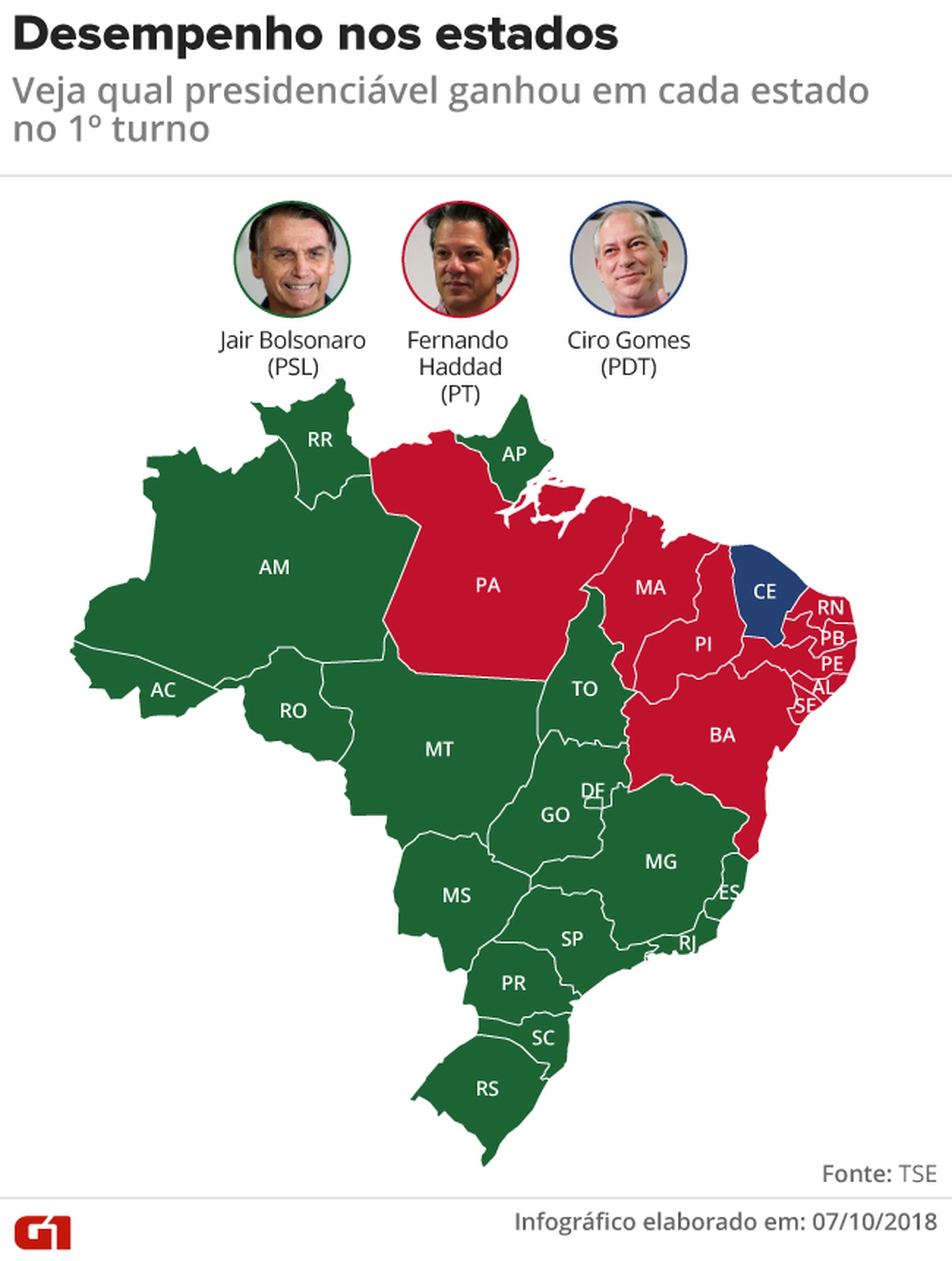 Com 100% das urnas apuradas, Jair Bolsonaro (PSL) venceu em 16 estados e no DF e Fernando Haddad (PT), em 9. Nas capitais, o placar foi de 23 a 3.