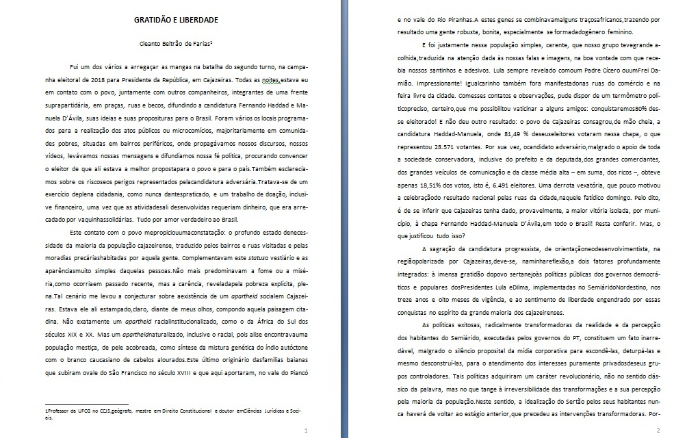 O professor cajazeirense Cleanto Beltrão de Farias, vinculado ao Curso de Direito da Universidade Federal de Campina Grande, Campus de Sousa, divulgou recentemente um artigo científico sobre a eleição presidencial deste ano.