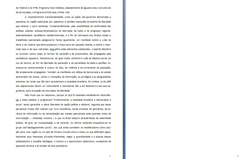 Defensor da candidatura de Fernando Haddad e Manuela D’Ávila, o professor escreveu que fez uma previsão de vitória em Cajazeiras no segundo turno de 80% pro petista.