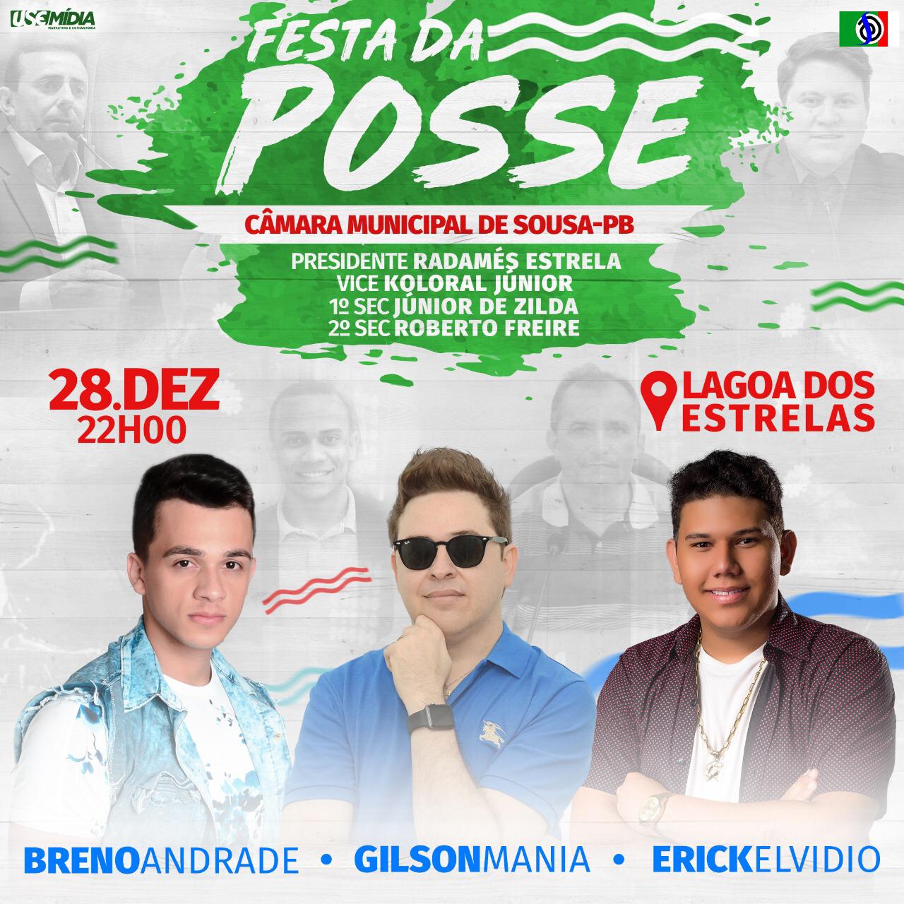 O vereador Radamés Estrela faz um convite à população sousense para comparecer a “Festa da Posse” que será realizada às 22h na Lagoa dos Estrelas em Sousa, com as seguintes atrações musicais: Breno Abrante, Gilsom Mania e Erick Elvidio.