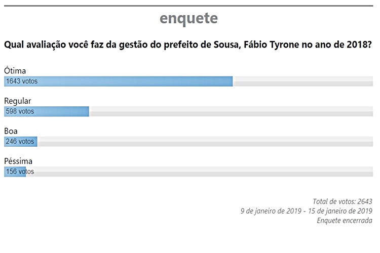 Foi encerrada nesta terça-feira (15), a enquete realizada pelo Portal Diário do Sertão, para a avaliação da gestão feita pelo prefeito de Sousa, Fábio Tyrone (PSB) no ano de 2018.