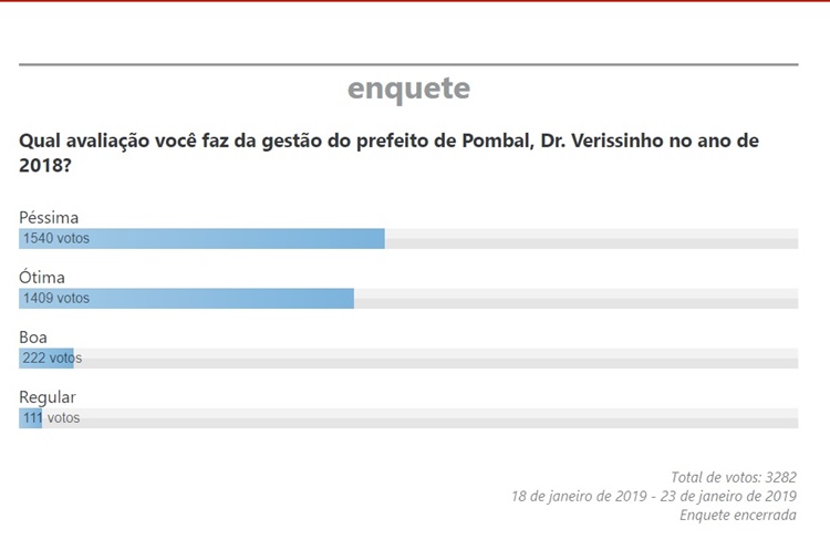 Foi encerrada nesta quarta-feira (23) a enquete realizada pelo Portal Diário do Sertão, para a avaliação da gestão feita pelo prefeito de Pombal, Abmael de Sousa Lacerda, mais conhecido como Dr. Verissinho (PMDB) no ano de 2018.