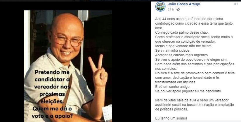 O professor de história, João Bosco Araújo, pretende lançar a sua candidatura a vereador na cidade de Sousa, Sertão do estado.