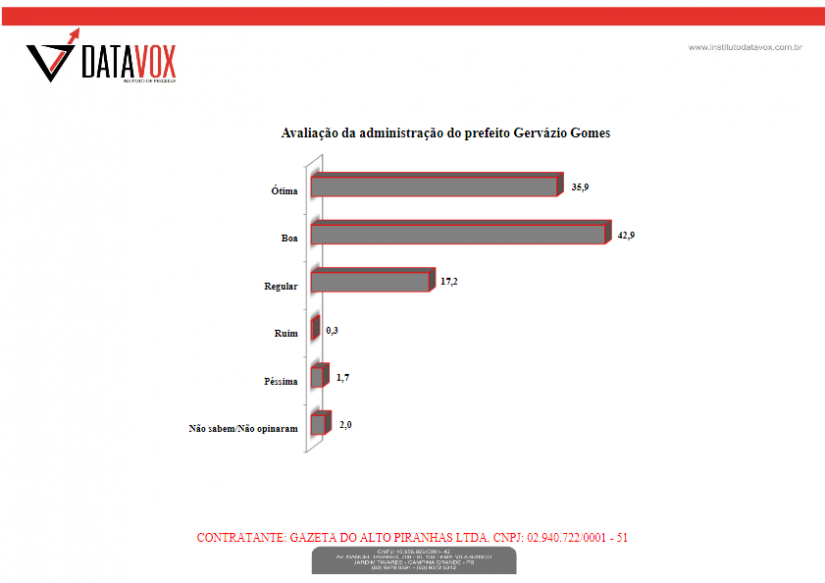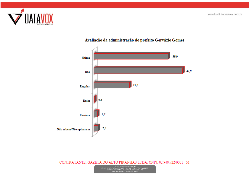 Sobre a avaliação do índice de aprovação da administração do prefeito a população respondeu de forma aplausível e favorável a dinâmica administrativa do gestor. O prefeito foi aprovado nos três requisitos, sendo: ótimo 35,9%; boa 42,9% e regular 17,2%, perfazendo um percentual favorável ao gestor Gervásio Gomes, de 89.4%, dos entrevistados.
