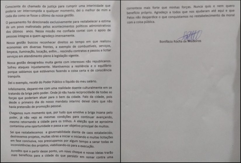 Fonte: Artur Lira, G1 PB - https://g1.globo.com/pb/paraiba/noticia/2019/04/04/prefeito-interino-de-patos-bonifacio-rocha-renuncia-ao-cargo-em-carta.ghtml