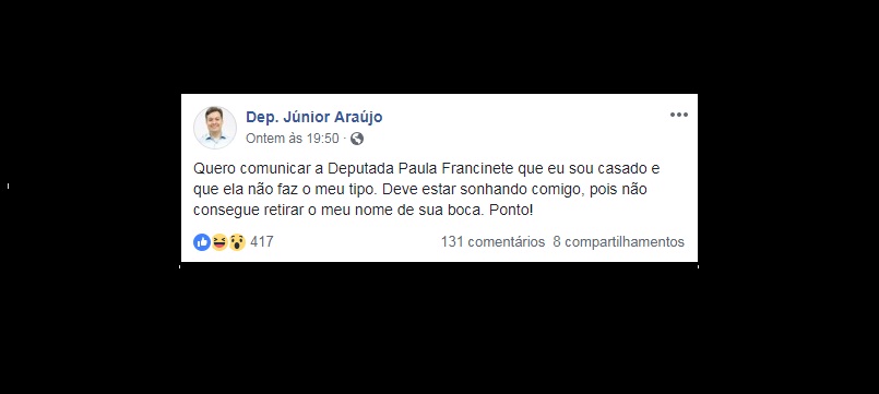 Na sua página no Facebook, Júnior escreveu: “Quero comunicar a Deputada Paula Francinete que eu sou casado e que ela não faz o meu tipo. Deve estar sonhando comigo, pois não consegue retirar o meu nome de sua boca. Ponto!”.