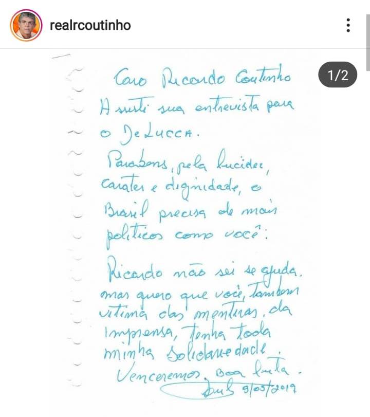 Nas redes sociais, Ricardo Coutinho postou uma foto do bilhete com a seguinte legenda: “O ex-presidente Lula assistiu à entrevista que concedi ao @brasil_247. Recebi dele uma mensagem que fortalece a nossa luta pelo povo paraibano e brasileiro. Não nos renderemos ao ataque de fake news e nem permitiremos a destruição da democracia tão arduamente conquistada. Sigamos!”