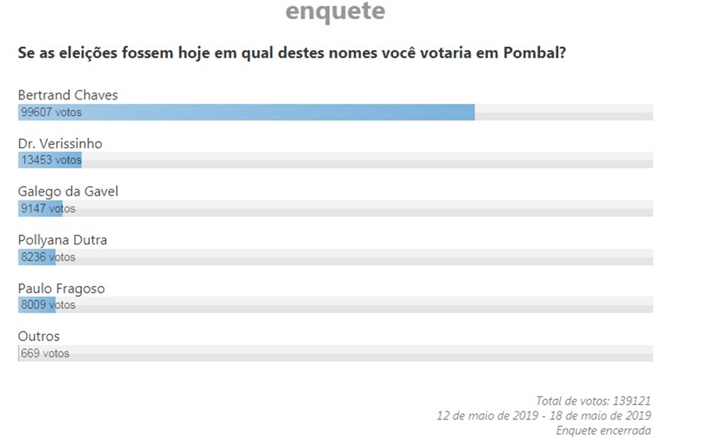 Ao todo a enquete recebeu 138.121 acessos, para optar por cinco nomes que poderão disputar a prefeitura de Pombal no próximo ano.