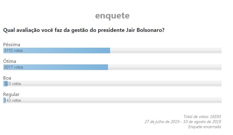 Com a pergunta “Qual avaliação você faz da gestão do presidente Jair Bolsonaro?”, o internauta poderia optar entre ótima, boa, regular e péssima.
