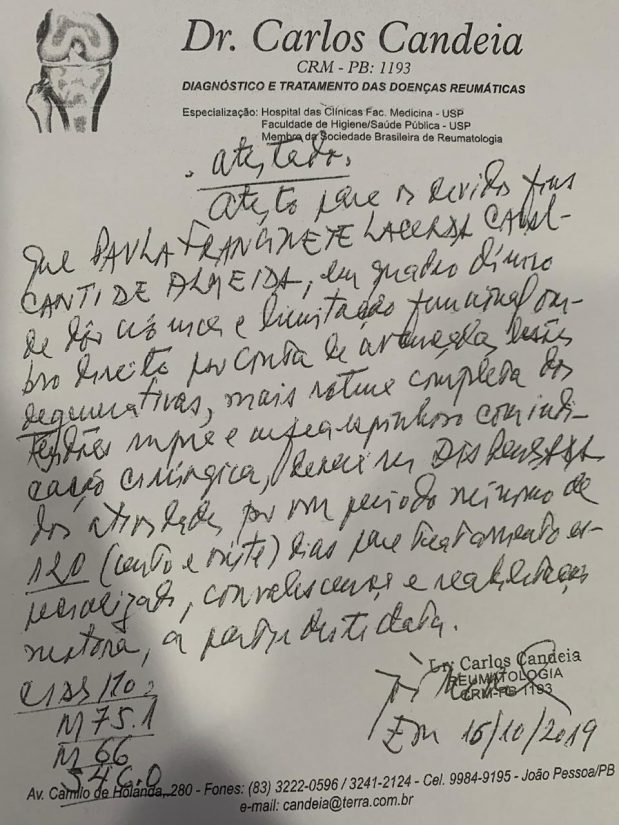 A deputada cajazeirense esclareceu que durante licença médica, ela receberá salário normalmente porque o caso não se trata de afastamento por questões pessoais