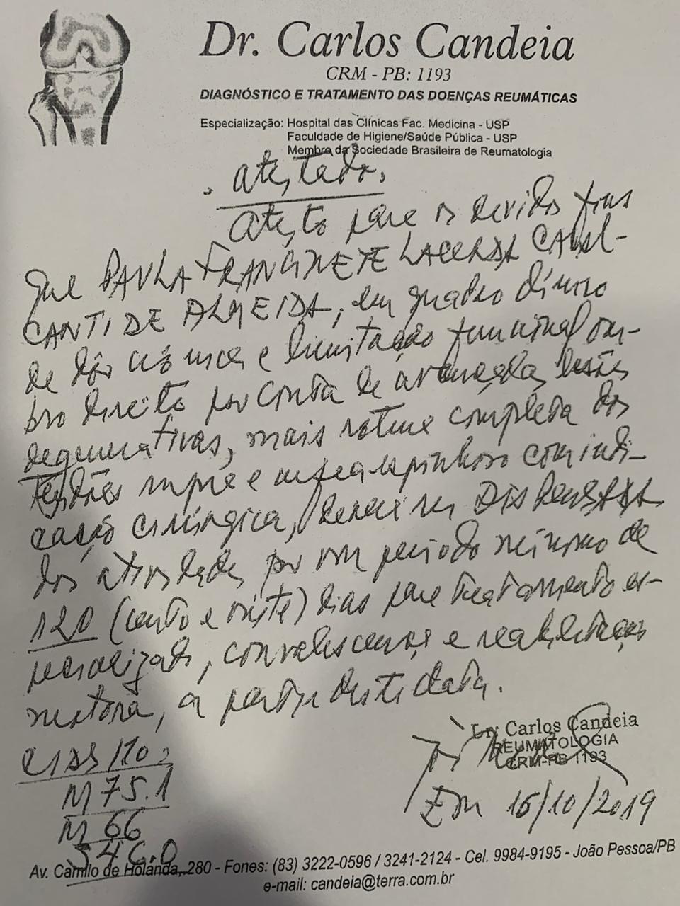 Doutora Paula disse à TV Diário do Sertão que precisa se afastar para realizar dois procedimentos cirúrgicos. O primeiro será no nariz que foi fraturado numa queda que ela sofreu em maio deste ano, durante audiência no plenário do Tribunal Regional do Trabalho (TRT-PB) em João Pessoa.