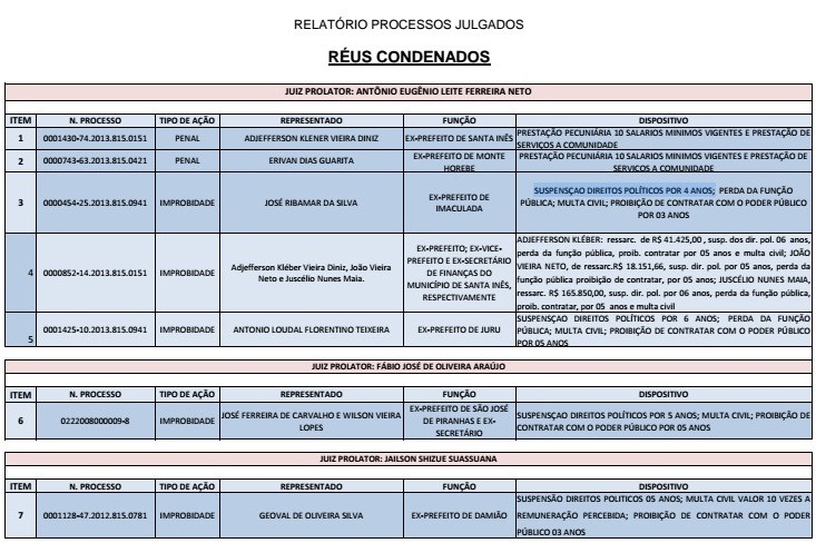 Também está na lista, o ex-prefeito de Imaculada, José Ribamar da Silva condenado pela perda da função pública; multa civil; proibição de contratar com o poder público por 03 anos e suspensão direitos políticos por 4 anos.