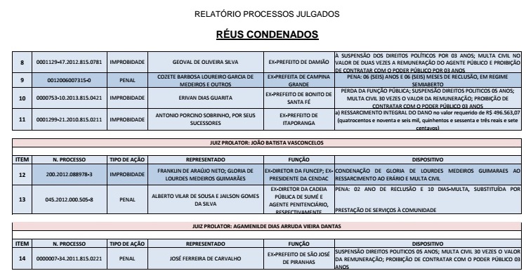 O Tribunal de Justiça da Paraíba divulgou nesta sexta-feira (18), o 7º lote de sentenças referente ao julgamento de ações de Improbidade Administrativa e Crimes Contra a Administração Pública, dos processos relacionados pela Meta 4 do Conselho Nacional de Justiça.