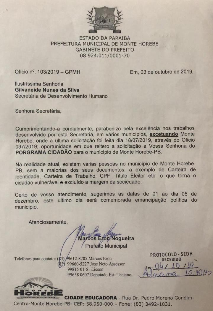 Marcos Eron afirma que já fez várias solicitações, através de ofício, para que a Secretaria de Estado do Desenvolvimento Humano enviasse a Monte Horebe o Programa Cidadão, mas ele nunca foi atendido. O programa promove emissão de documentos pessoais de forma gratuita e rápida.
