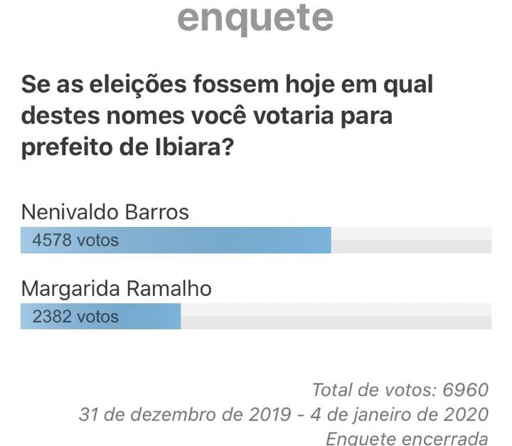 A enquete foi ao ar em 31 de dezembro de 2019, sendo concluída nesse sábado (04), com a seguinte pergunta: “Se as eleições fossem hoje em qual destes nomes você votaria para prefeito de Ibiara?”.