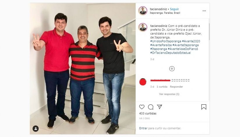 “Tem-se feito entendimentos, buscamos o grupo de oposição ao prefeito Divaldo [Dantas, PMDB], capitaneado pelo ex-prefeito e ex-deputado Djaci Brasileiro, que irá compor na chapa indicando a pré-candidatura a vice-prefeito na majoritária do atual prefeito. O prefeito Divaldo tem sugerido o nome do médico Dr. Junior Diniz e está sendo feita uma rodada de entendimentos com os vereadores da base, lideranças políticas e também com vereadores de oposição, com os empresários e a sociedade civil de Itaporanga”, explicou o deputado.