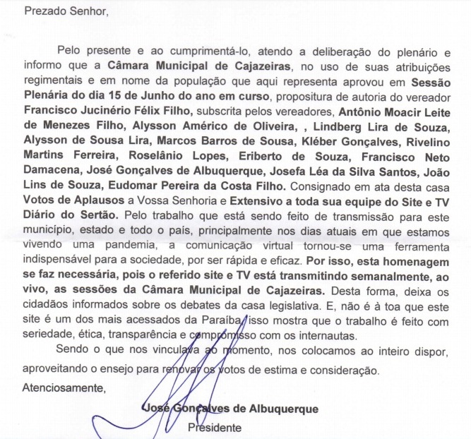 “A comunicação virtual tornou-se uma ferramenta indispensável para a sociedade, por ser rápida e eficaz. Por isto, esta homenagem se faz necessária, pois o referido site e TV está transmitindo semanalmente, ao vivo, as sessões da Câmara Municipal de Cajazeiras”. diz trecho do ofício.