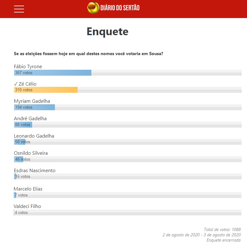 O portal Diário do Sertão realizou entre os dias 02 (domingo) e 03 (segunda) de agosto uma enquete, onde perguntava: “se as eleições fossem hoje em quem você votaria para prefeito de Sousa?”.