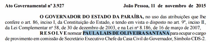 O governador Ricardo Coutinho (PSB) nomeou nessa quarta-feira (11), a advogada cajazeirense, Paula Laís de Oliveira Santana, para o chefia da Casa Civil do estado.