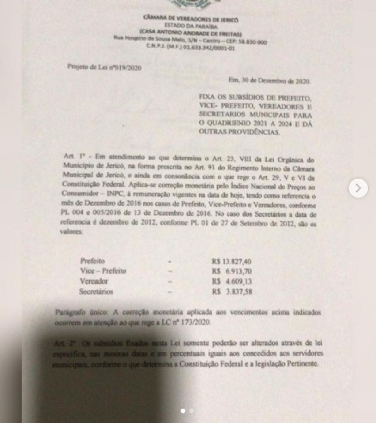 Quanto aos proventos dos secretários que eram de R$ 2.500 passam para R$ 3.837,58 e por fim, os vereadores que recebiam mensalmente R$ 3.500 a partir de 2021 passarão a receber R$ 4.609,13.