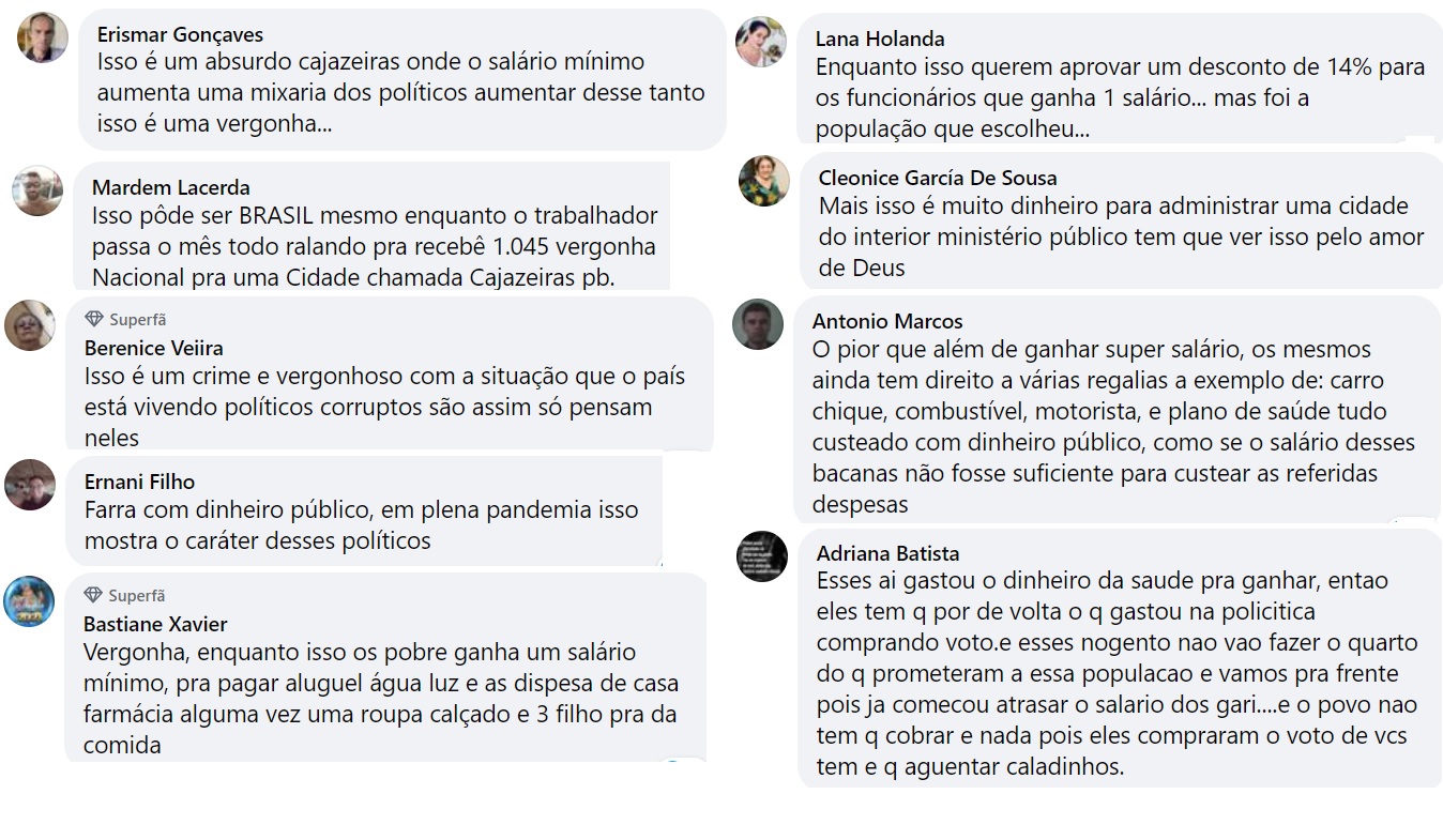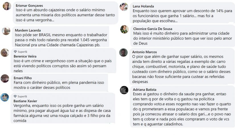 Nas redes sociais, a população de Cajazeiras vem repudiando o aumento dos salários dos políticos de Cajazeiras.