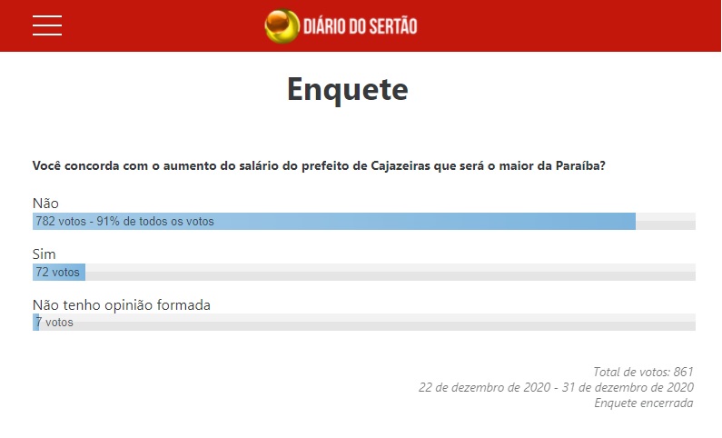 Em enquete realizada pelo portal Diário do Sertão entre os dias 22 e 31 de dezembro de 2020, 91% dos internautas reprovam o aumento do salário do prefeito de Cajazeiras, Zé Aldemir (PP), que a partir deste mês de janeiro terá o maior salário de prefeito da Paraíba.