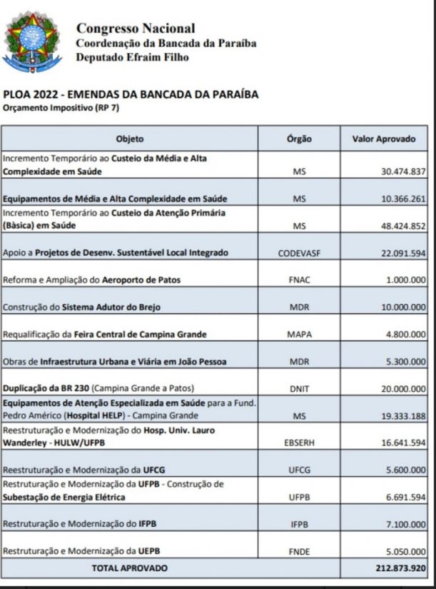 O coordenador da bancada paraibana no Congresso Nacional, deputado Efraim Filho, afirmou que foi confirmado nesta semana mais de R$ 200 milhões para o orçamento federal de 2022. Os recursos são frutos de 15 emendas aprovadas no âmbito do orçamento impositivo, o qual o governo tem obrigação de executar. As principais áreas contempladas foram a saúde (127 milhões), abastecimento de água (32 milhões), infraestrutura (31 milhões) e educação, com Universidades e IF (24 milhões).