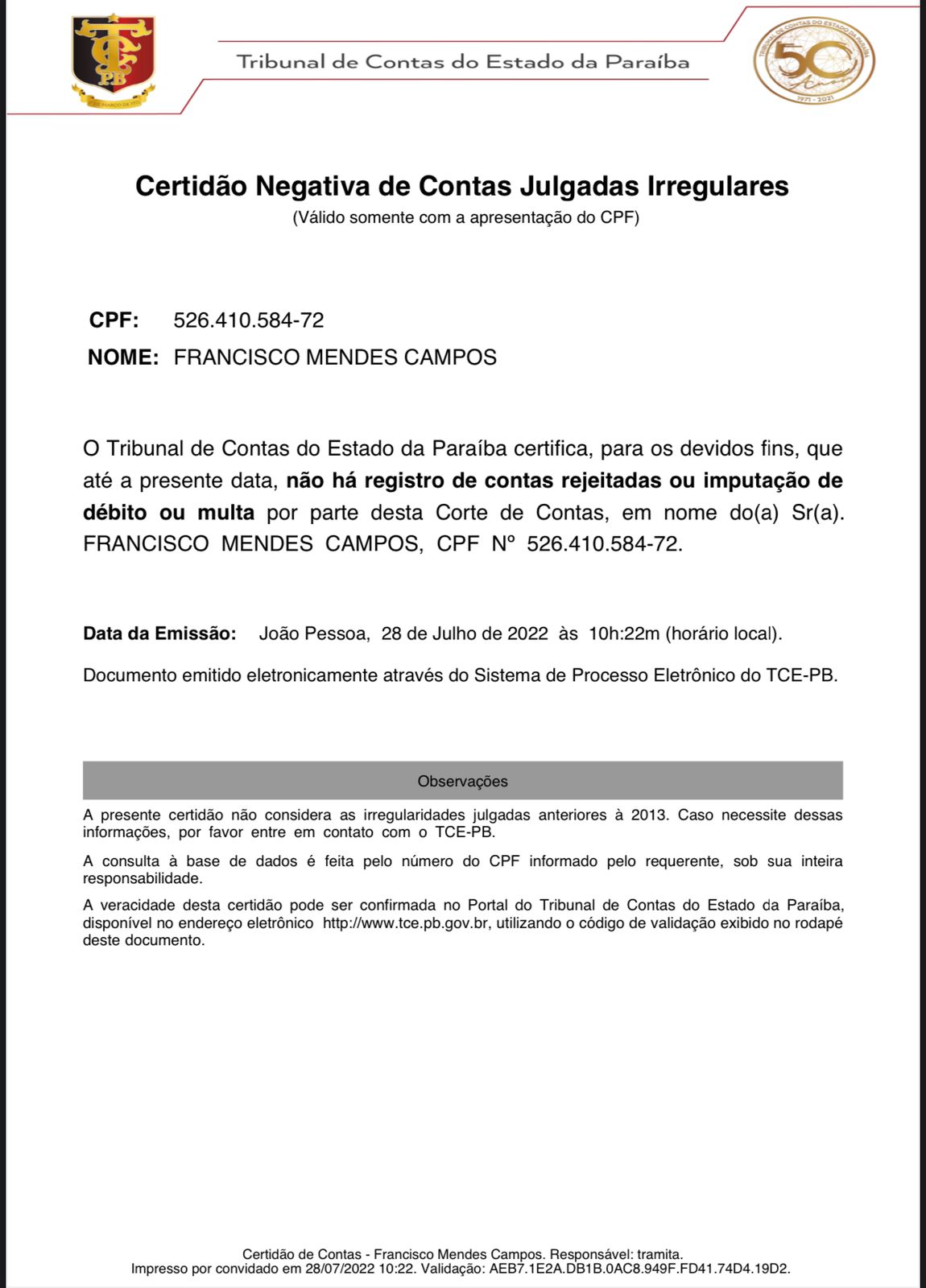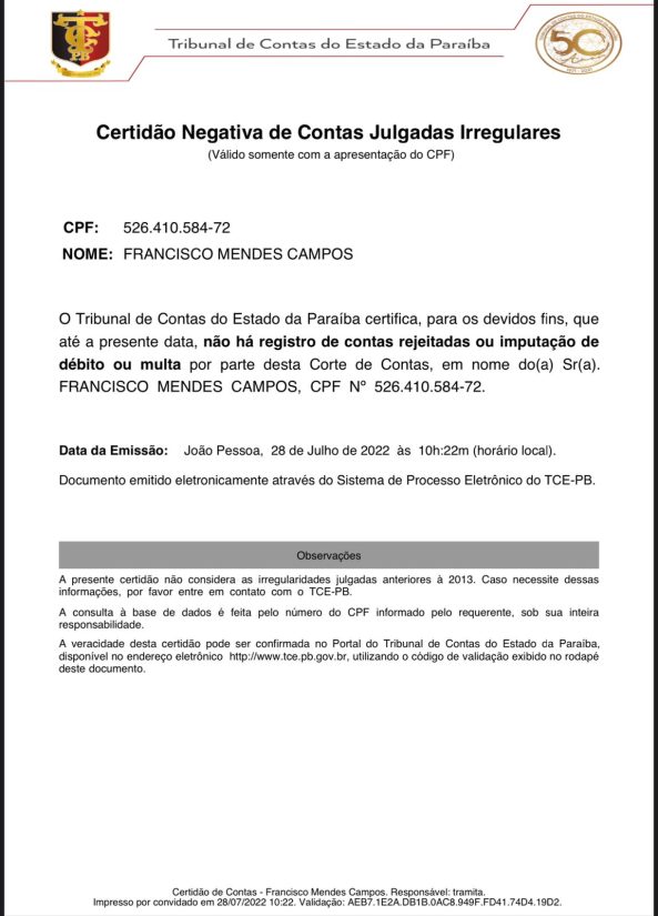 Nesta quinta-feira (28), o Tribunal de Contas do Estado da Paraíba emitiu uma certidão negativa de contas julgadas irregulares e atestou que ‘’não há registro de contas rejeitadas ou imputação de débito ou multa por parte’’ do TCE contra Chico Mendes, ou seja, o pré-candidato enquanto prefeito não teve nenhuma conta reprovada.