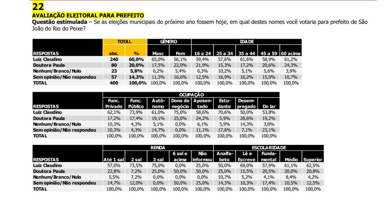 Os números do instituto apontam no item estimulado, que o atual prefeito de São João do Rio do Peixe tem 60% dos votantes, enquanto Dra. Paula teria 20%. Não responderam 14,2%, Branco e nulo 5,8.