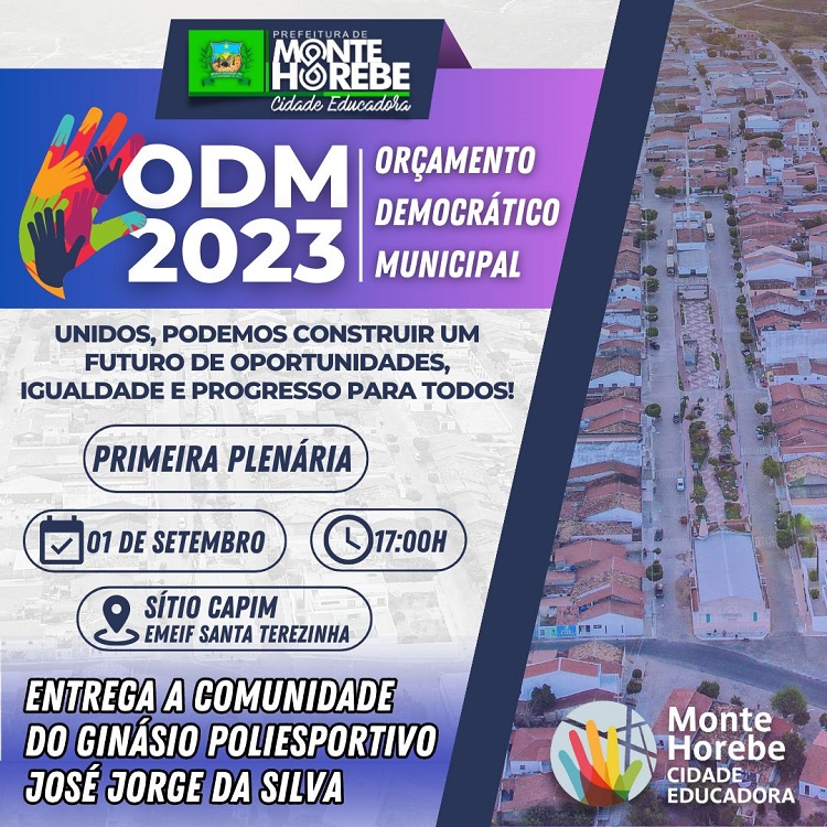 O prefeito de Monte Horebe, Marco Eron (MDB), convidou toda a população do município para participar da 1ª Plenária do Orçamento Democrático Municipal (ODM) 2023, que será realizada nesta sexta-feira (1º), na Escola EMEIF Santa Terezinha, no sítio Capim, zona rural horebense.