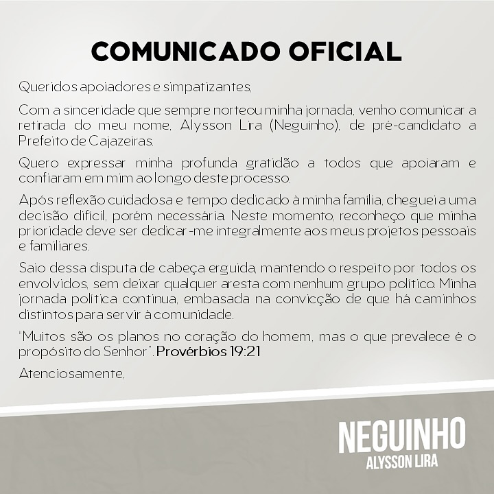 “Com a sinceridade que sempre norteou minha jornada, venho comunicar a retirada do meu nome, Alysson Lira (Neguinho), de pré-candidato a Prefeito de Cajazeiras”, anunciou.