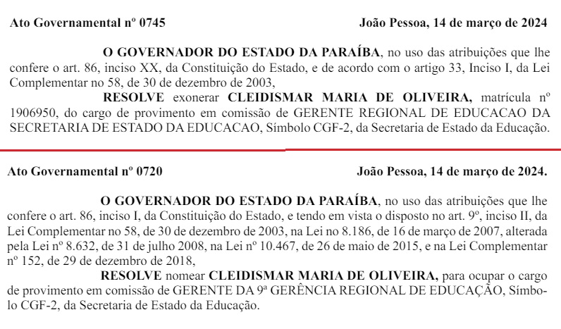 O Diário do Sertão apurou o fato e descobriu que a edição do DOE dessa sexta traz a exoneração de Cleidismar, mas também a nomeação dela para o mesmo cargo. Ou seja, houve exoneração seguida de nomeação em dois atos.