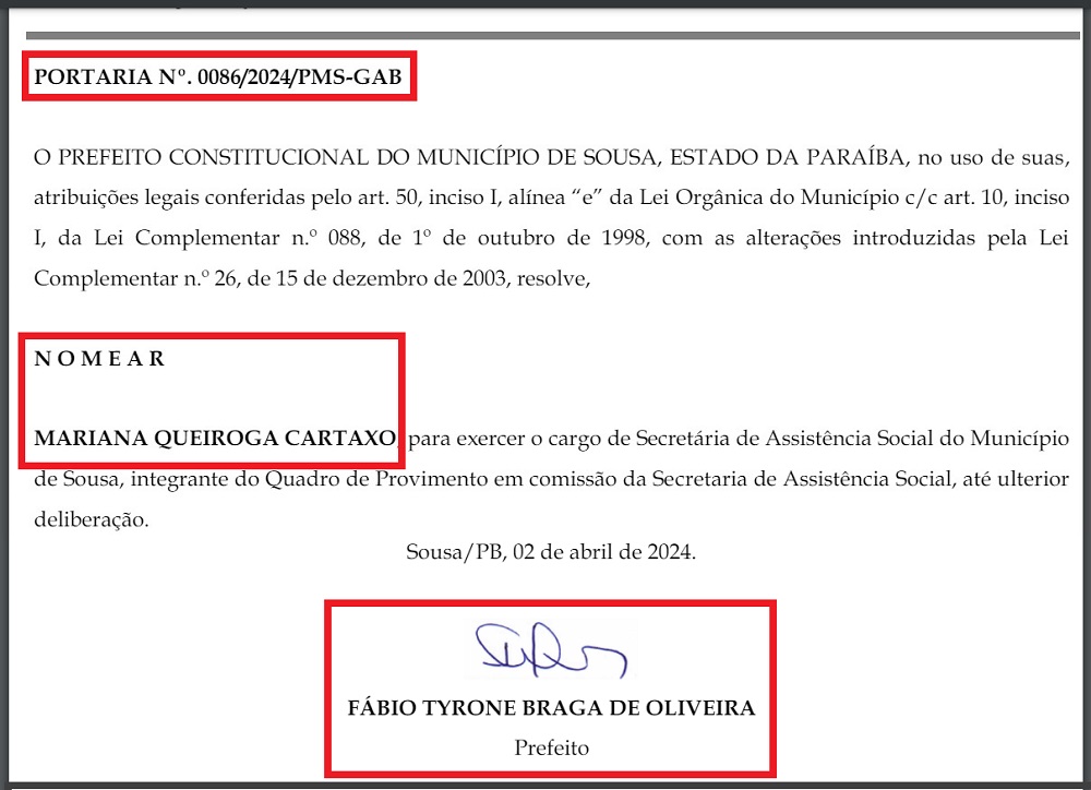 O prefeito de Sousa, Fábio Tyrone (PSB), nomeou a esposa para administrar a Secretaria de Assistência Social do município. O ato de nomeação da advogada Mariana Queiroga Cartaxo foi publicado na noite desta terça-feira (2), na edição número 1006 do jornal oficial do Município (Gazeta de Sousa), através da portaria número 0086/2024.