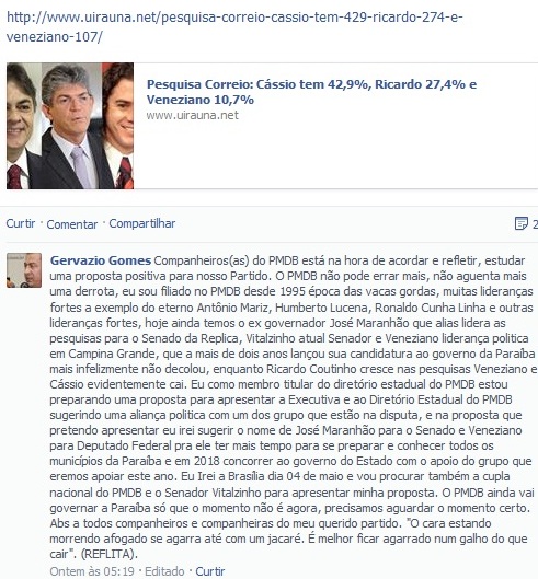 Um dos integrantes da executiva estadual do PMDB na Paraíba, o prefeito da cidade de Bernardino Batista, Gervázio Gomes, declarou esta semana na sua página do Facebook, que defende uma aliança de Veneziano Vital com o governador Ricardo Coutinho (PSB) ou com o senador Cássio Cunha Lima (PSDB).