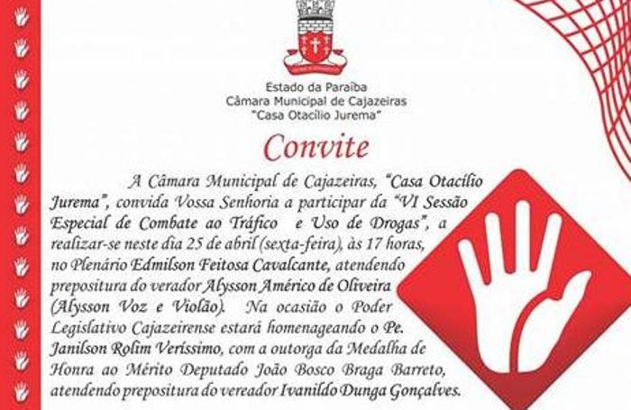 A câmara de vereadores da cidade de Cajazeiras vai realizar no próximo dia 25 de Abril, a VI Sessão de Combate ao Consumo e Tráfico de Drogas.