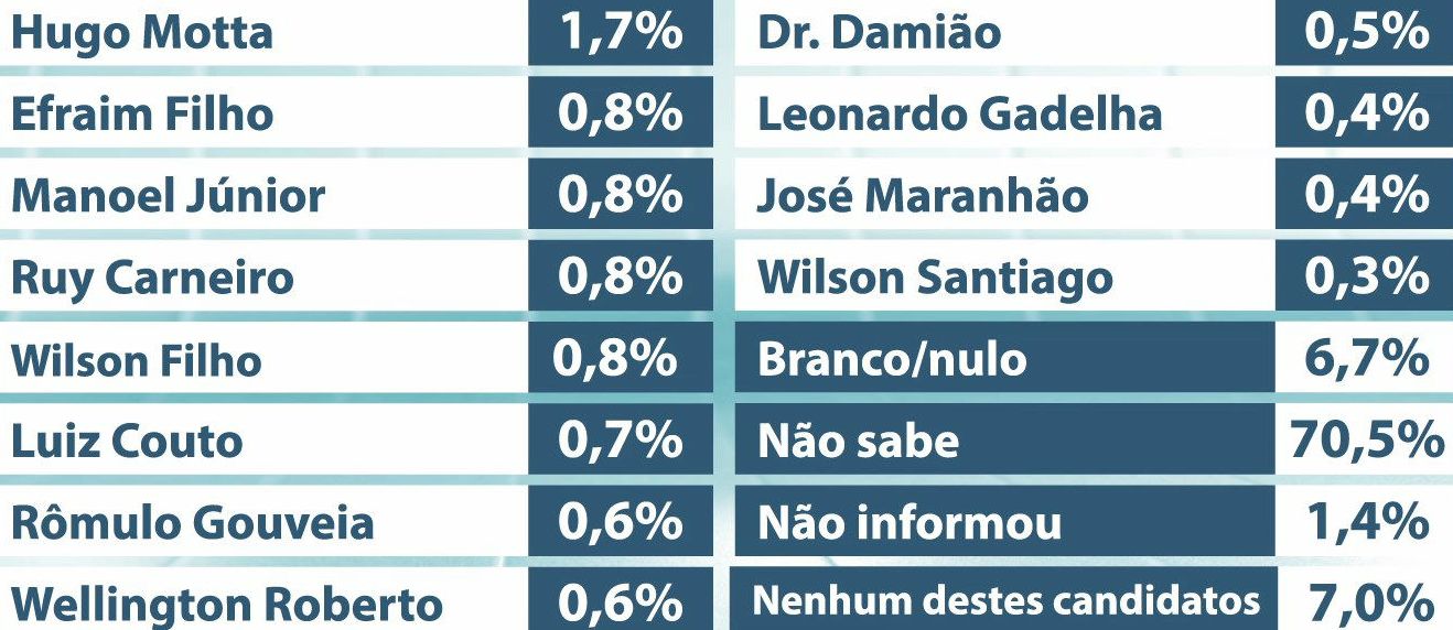 Hugo Motta obteve 1,7%, já Efraim Filho segue em segundo com 0,8%. Outros nomes estão na lista a exemplo de Manuel Junior, Wilson Filho e Wellington Roberto.