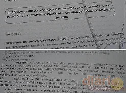 O juiz Diego Fernandes Guimarães da 4ª vara do Fórum de Sousa, determinou o afastamento das funções públicas inerentes ao mandato parlamentar do vereador Nedimar de Paiva Gadelha Júnior, mais conhecido como “Júnior de Nedimar” e do Presidente da Câmara, Eduardo Medeiros Silva. Eles estão envolvidos no esquema de “Funcionário fantasma” na Câmara Municipal de Sousa.