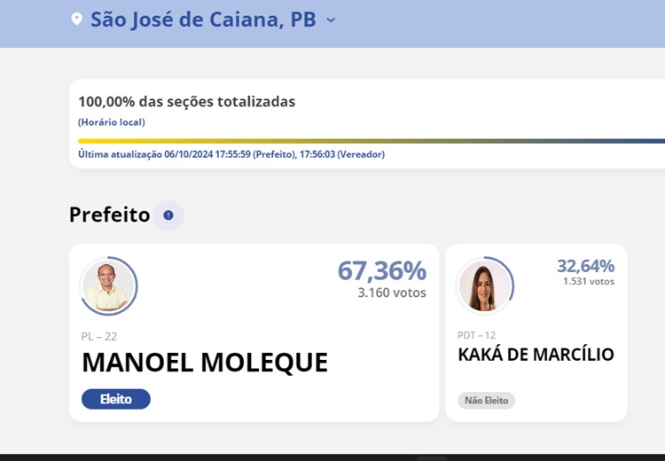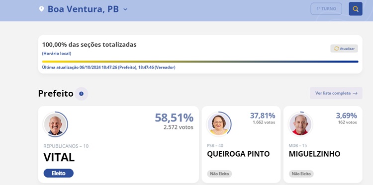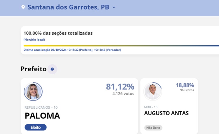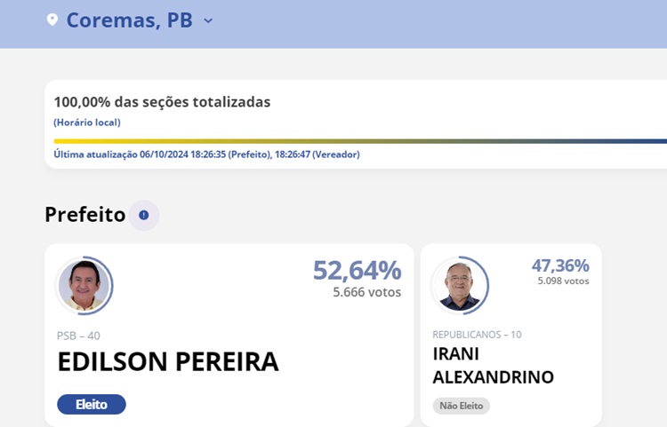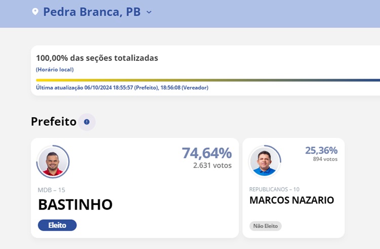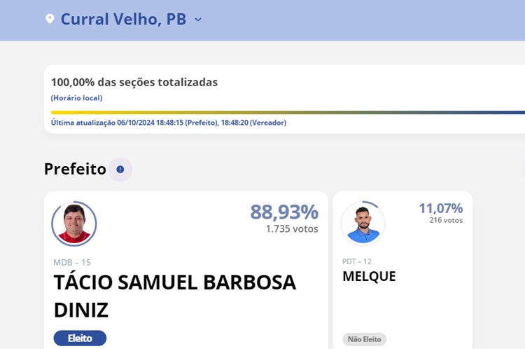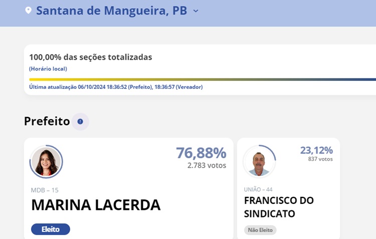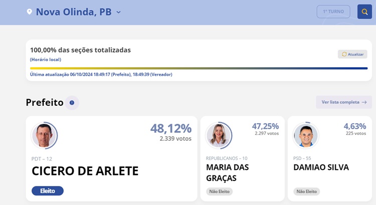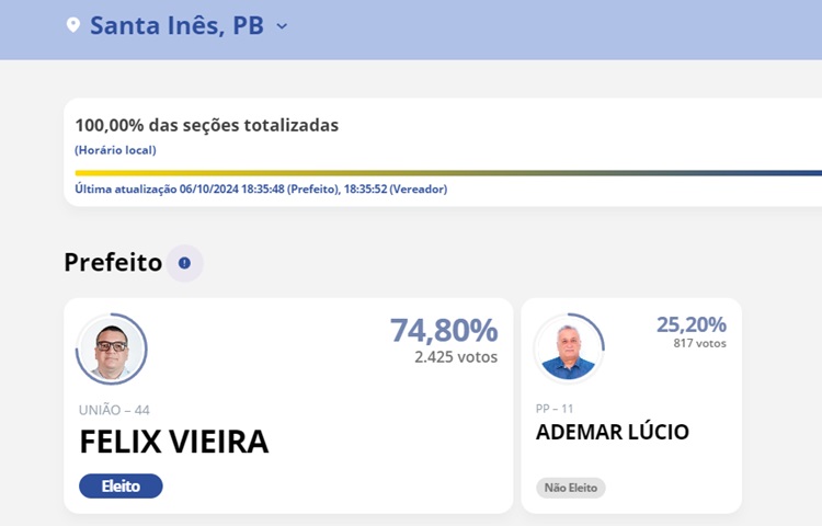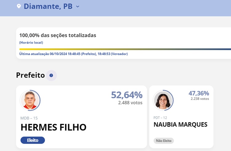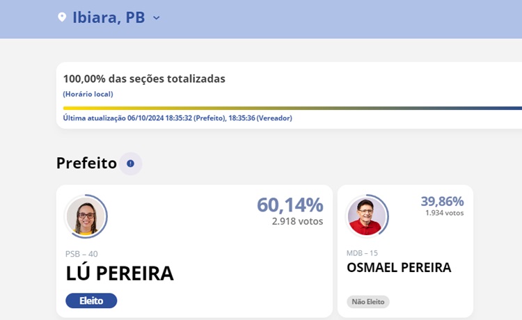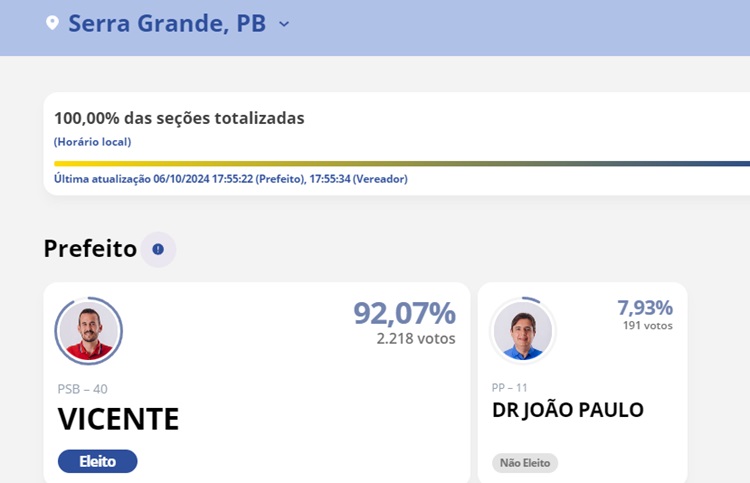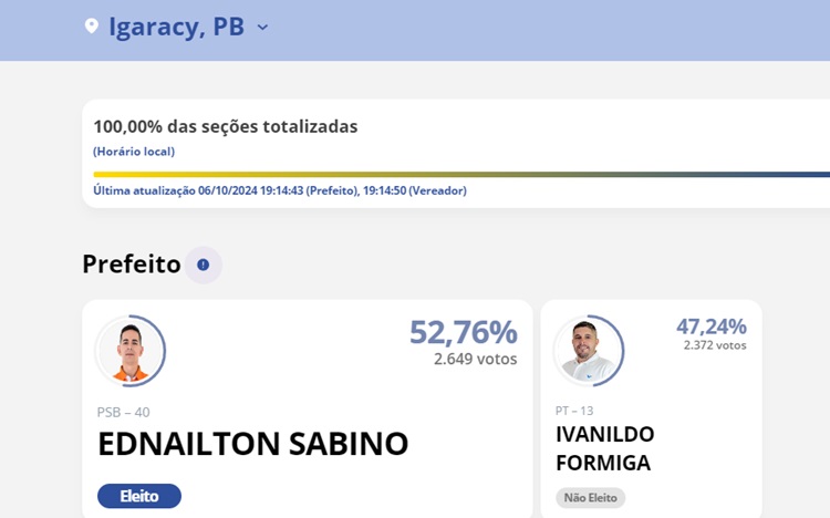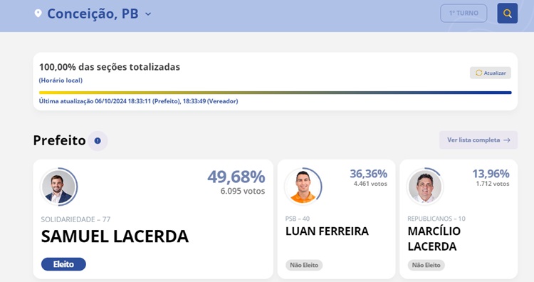 Já em Conceição, segundo município com maior número de população, Samuel Lacerda (Solidariedade), conseguiu se reeleger com 49,68% dos votos válidos.