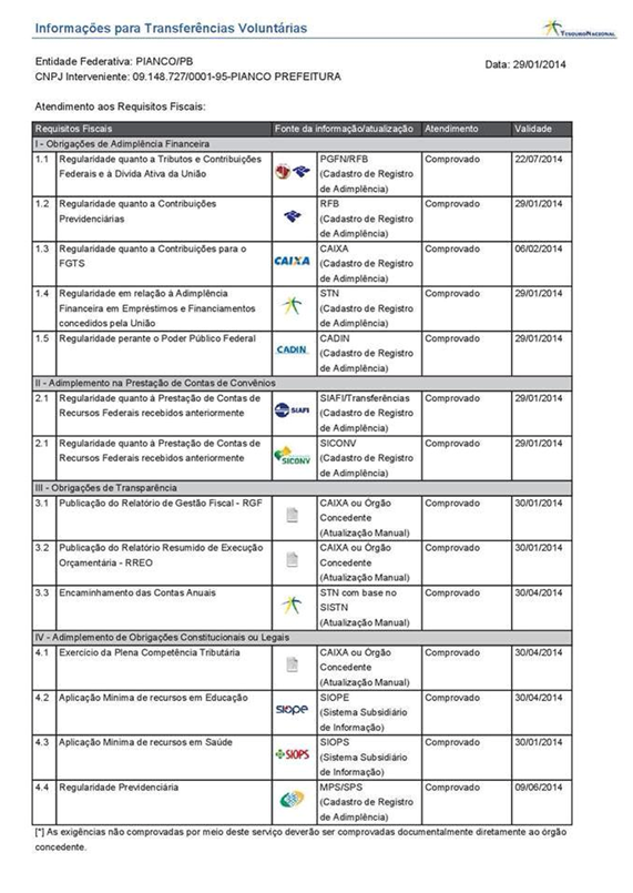 Além das medidas judiciais, o Município de Piancó implementou novos métodos de gestão e transparência pública. Com a combinação das estratégias judicial e de gestão, o Município conseguiu, pela primeira vez nos últimos seis anos, o status de adimplente. As informações divulgadas pelo Tesouro Nacional podem ser conferidas no Relatório a seguir.