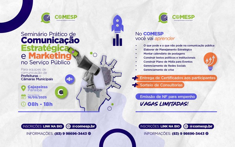 No dia 16 de setembro, a cidade de Cajazeiras sediará o Seminário Prático de Comunicação e Marketing para o Setor Público, voltado exclusivamente para equipes de comunicação de prefeituras e câmaras municipais. Diferente de eventos tradicionais, o Seminário não será um circuito de palestras, mas sim um dia inteiro de imersão prática, com atividades voltadas para a aplicação direta dos conhecimentos no cotidiano das administrações públicas.