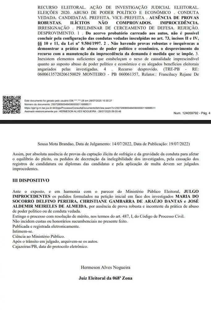 A Justiça Eleitoral, por meio do juiz Hermeson Alves Nogueira, da 68ª Zona Eleitoral, julgou improcedente uma Ação Investigação Judicial Eleitoral (AIJE) movida pelo PSB de Cajazeiras que pedia a cassação dos diplomas da prefeita Corrinha Delfino (PP), da vice-prefeita Christiane Araújo (PSD), além de suas inelegibilidades e do ex-prefeito Zé Aldemir (PP), alegando uso da máquina pública na campanha eleitoral de 2024.
