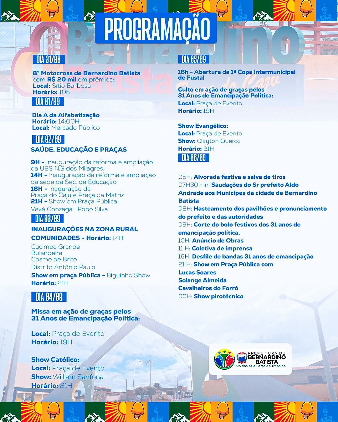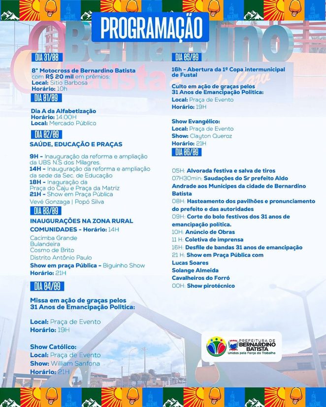 A extensa programação começa no dia 31 de agosto e vai até dia 06 de setembro, com inaugurações de obras, ações sociais, eventos cívicos, esportivos e a grande festa pública com atrações musicais nacionais.