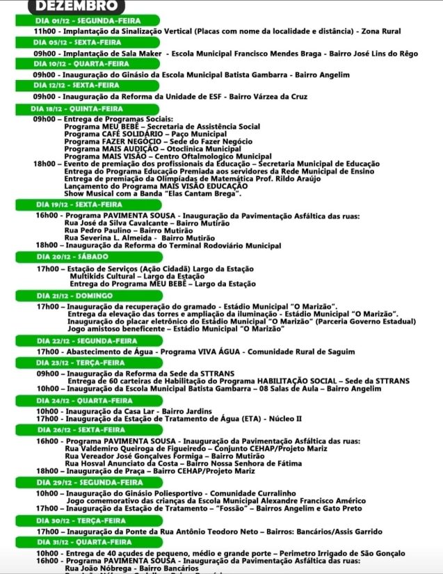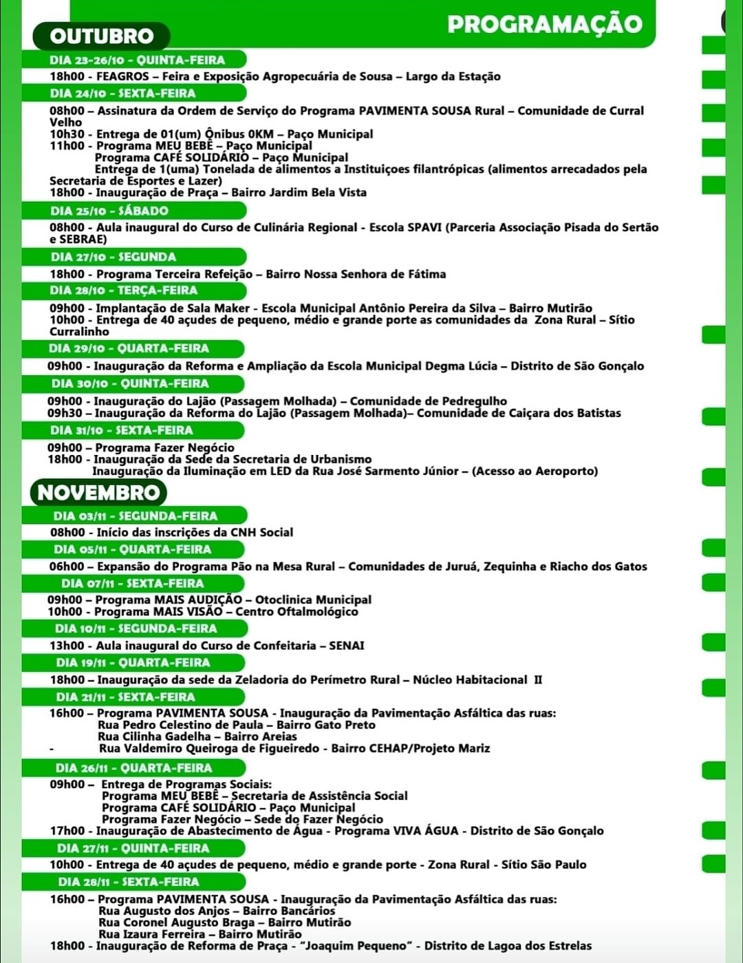 Em outubro, o prefeito apresentou mais uma edição do calendário trimestral “Mais por Sousa”, onde consta o cronograma do que já foi inaugurado e do que ainda está sendo feito. Ao todo, são R$ 15 milhçoes em investimentos.