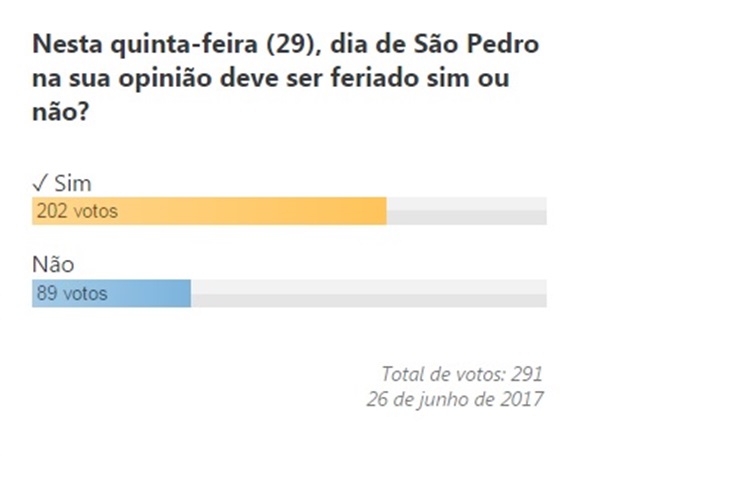 No intervalo de uma hora, 291 pessoas participaram da enquete, sendo que 202 disseram “SIM” para o feriado e 89 disseram “NÃO”.